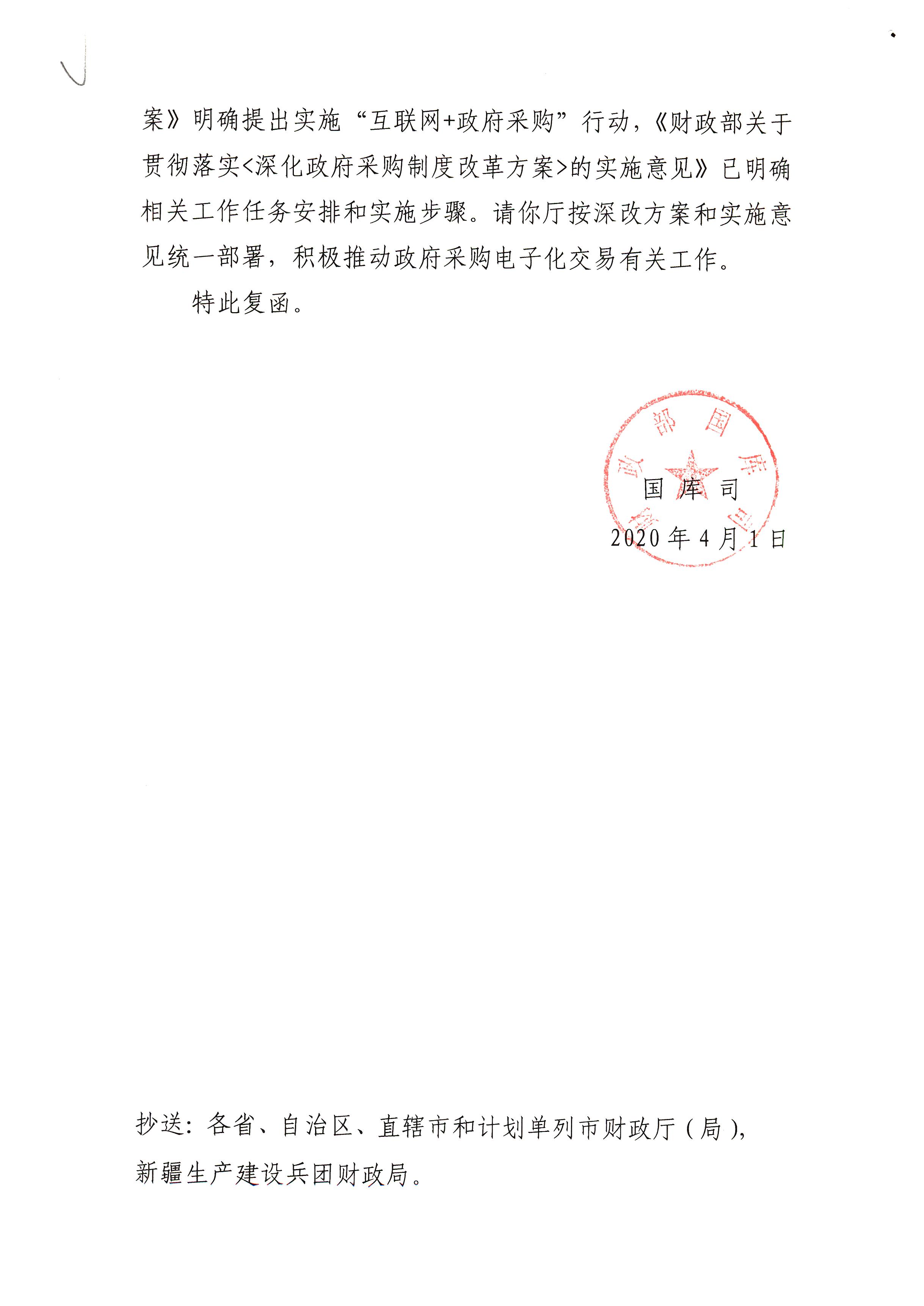 三、中央深改委审议通过的《深化政府采购制度改革方案》明确提出实施“互联网+政府采购”行动,《财政部关于贯彻落实〈深化政府采购制度改革方案〉的实施意见》已明确相关工作任务安排和实施步骤。请你厅按深改方案和实施意见统一部署,积极推动政府采购电子化交易有关工作。